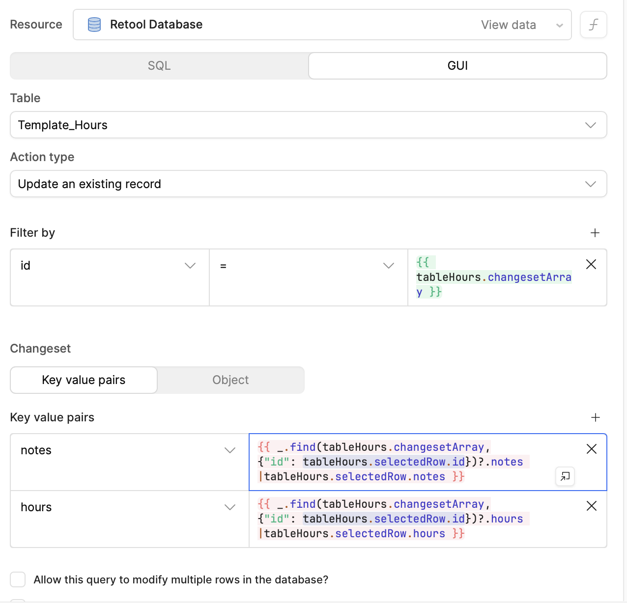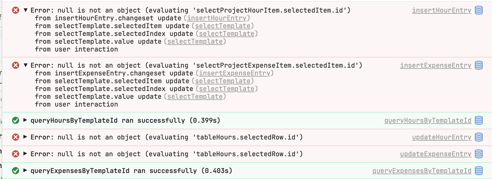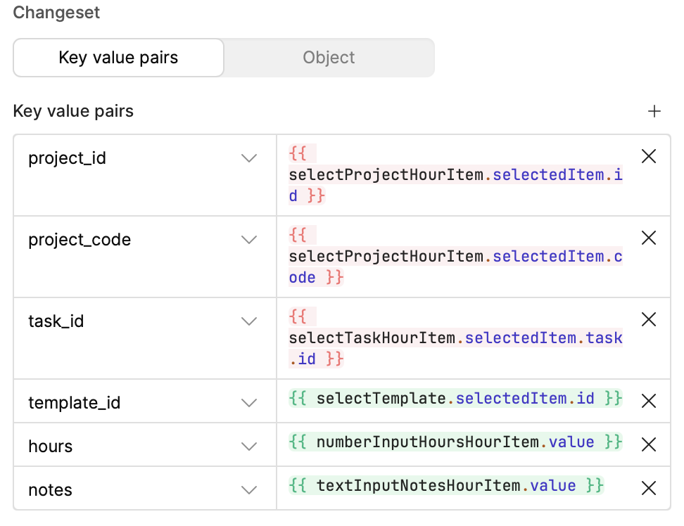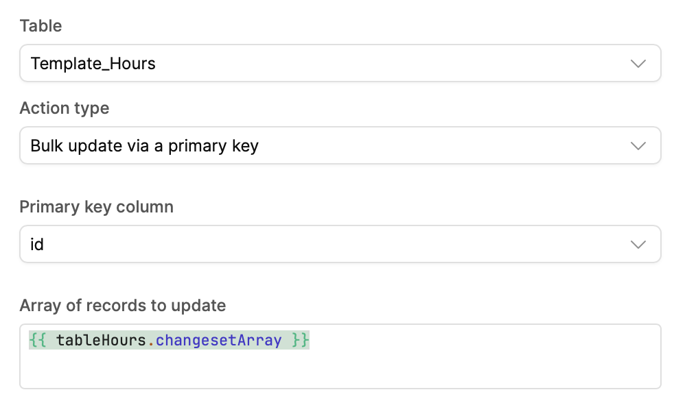 The green {{ tableHours.changesetArray }} looks fine. The error is coming from tableHours.selectedRow.id being read while there’s no row selected. So your update query is being triggered by the template change, and somewhere inside updateHourEntry (or a pre/post step) you still reference tableHours.selectedRow.id.