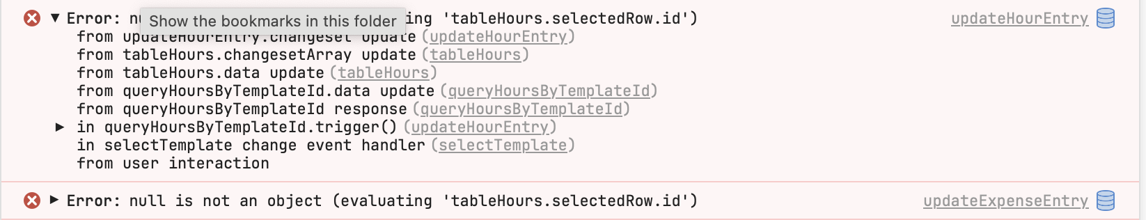 How do you trigger this? Search the whole app for tableHours.selectedRow.id. It should be in one of these places: