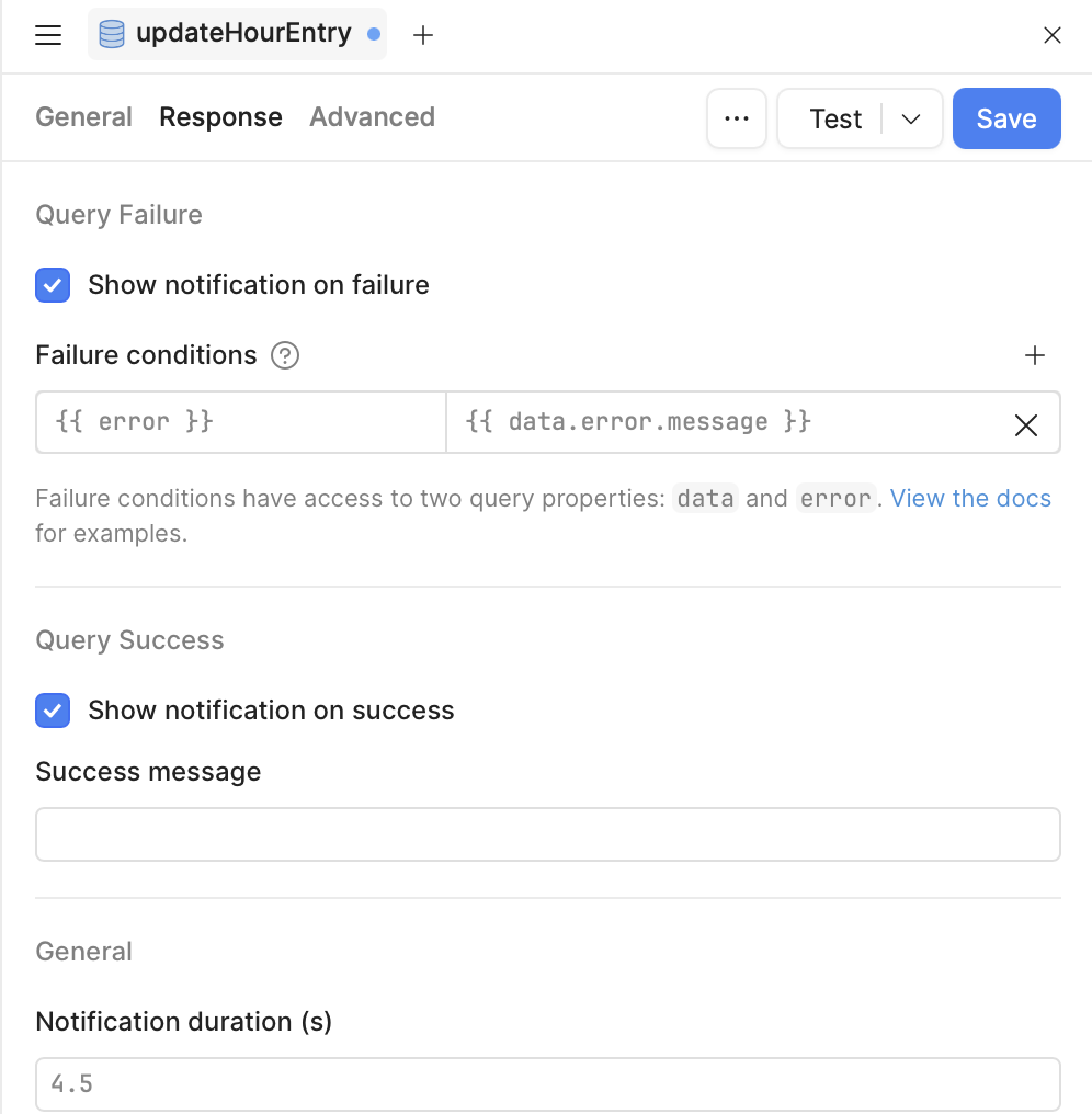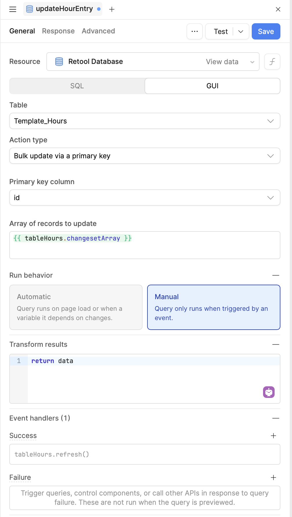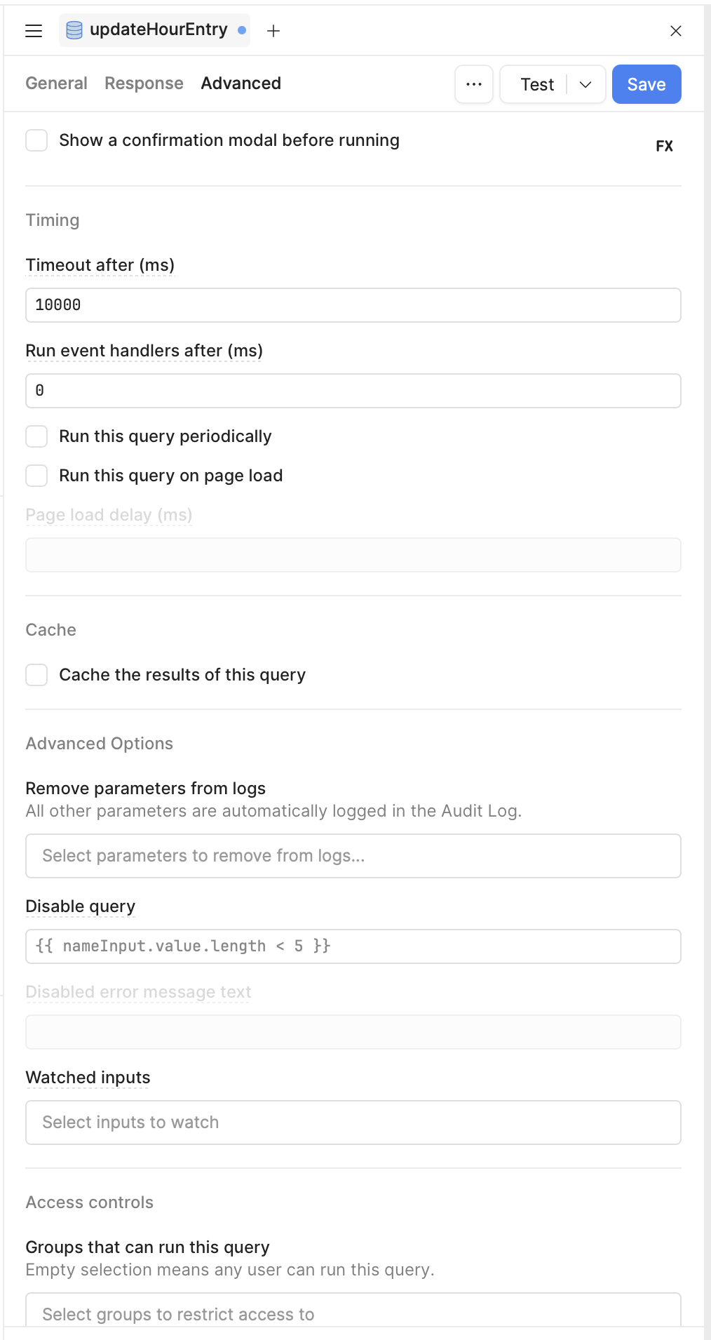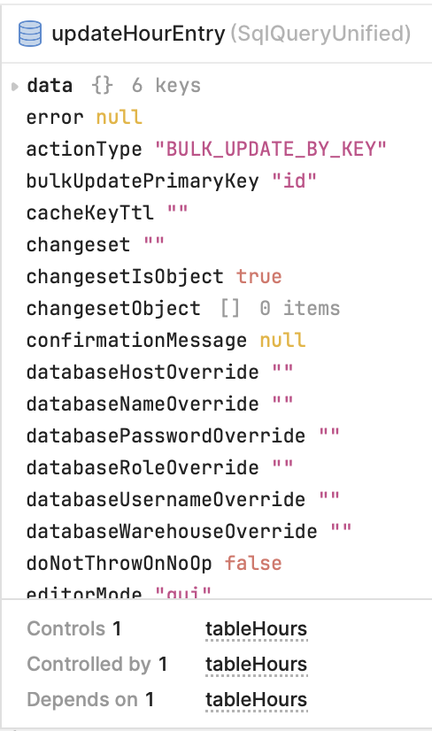 updateHourEntry query (GUI fields, SQL, “Enabled when”, “Only run when inputs change”, or Watched inputs)