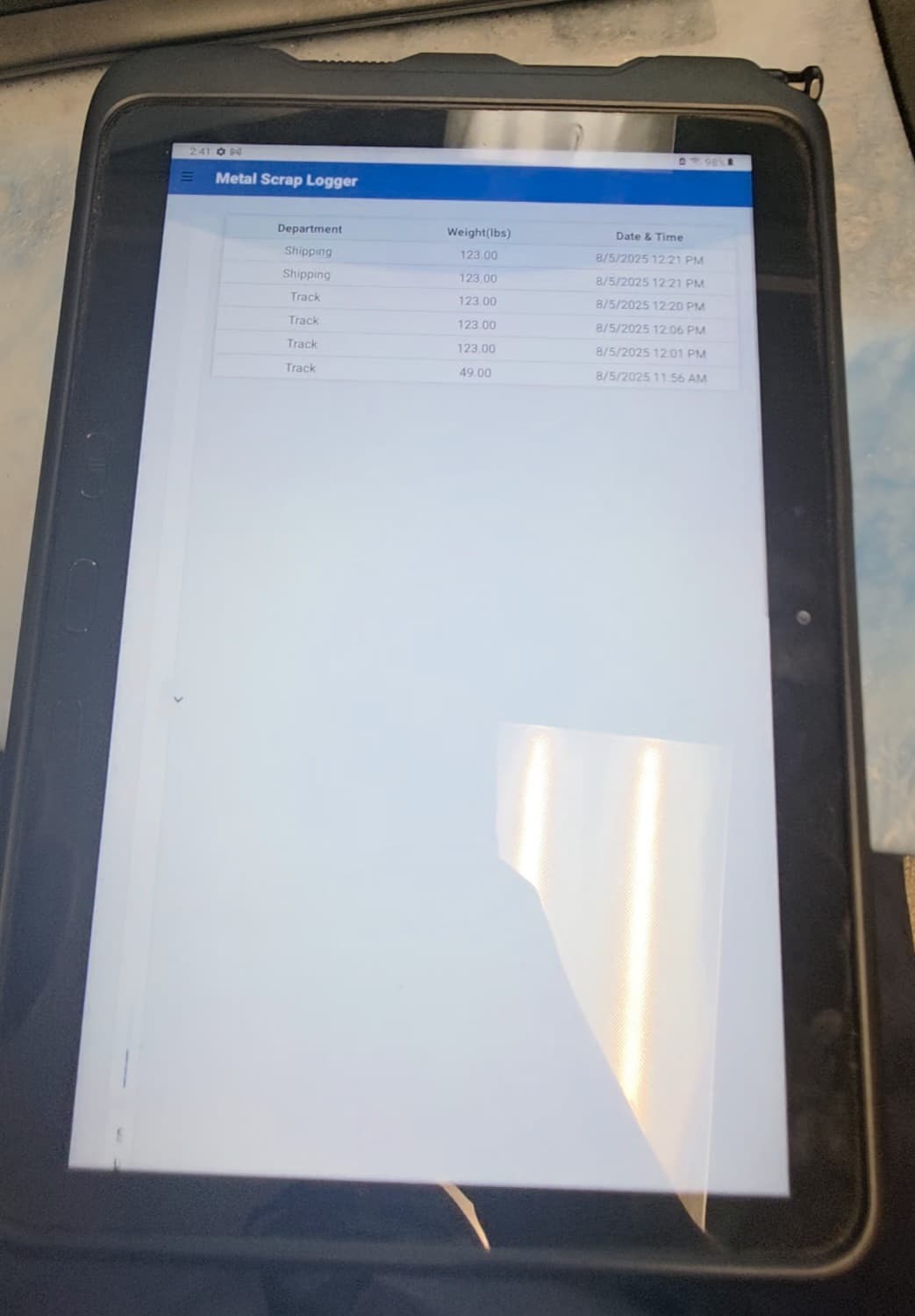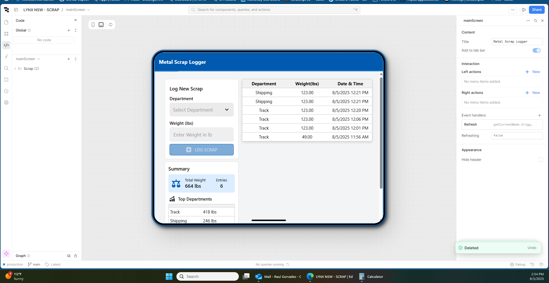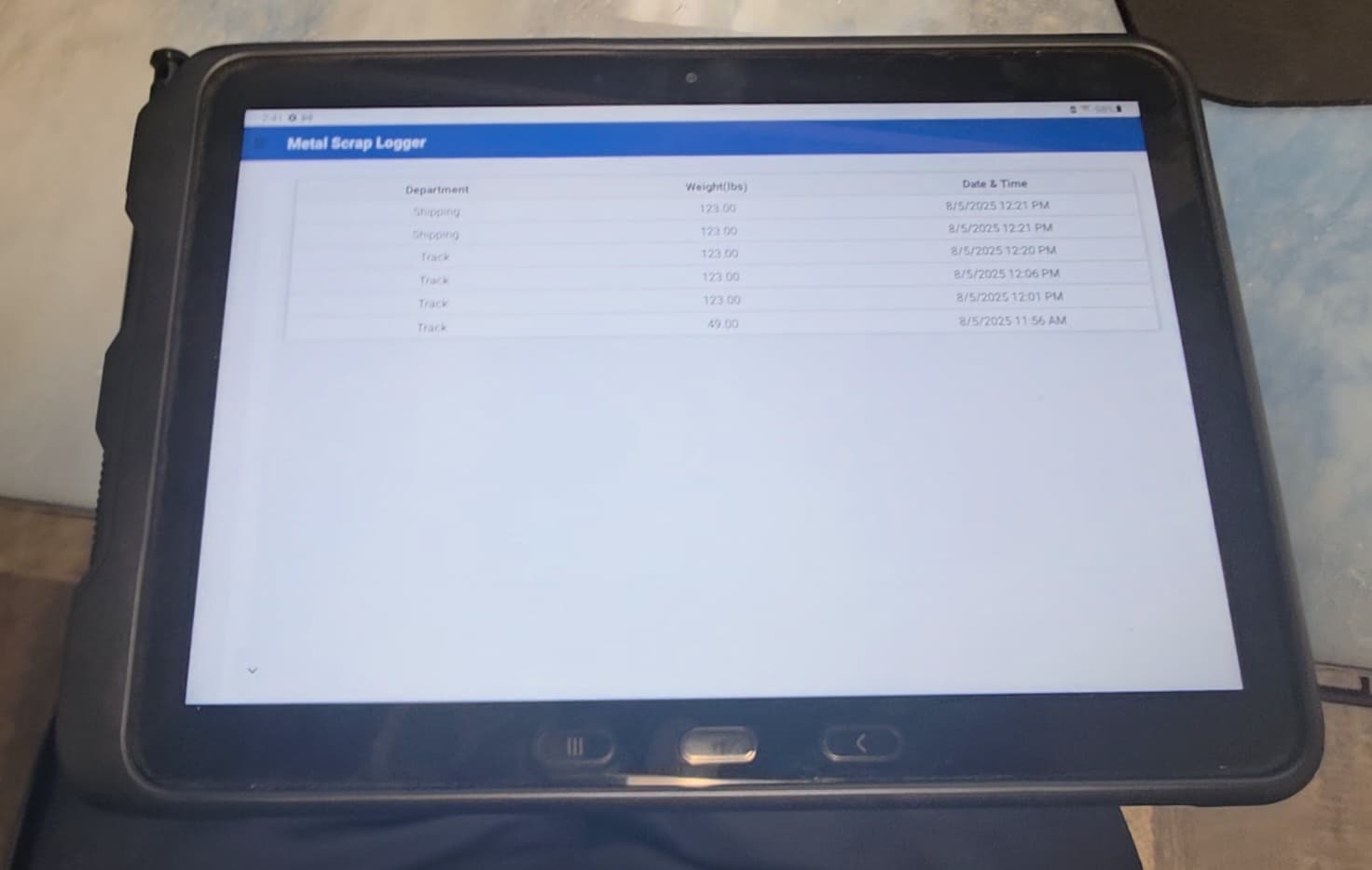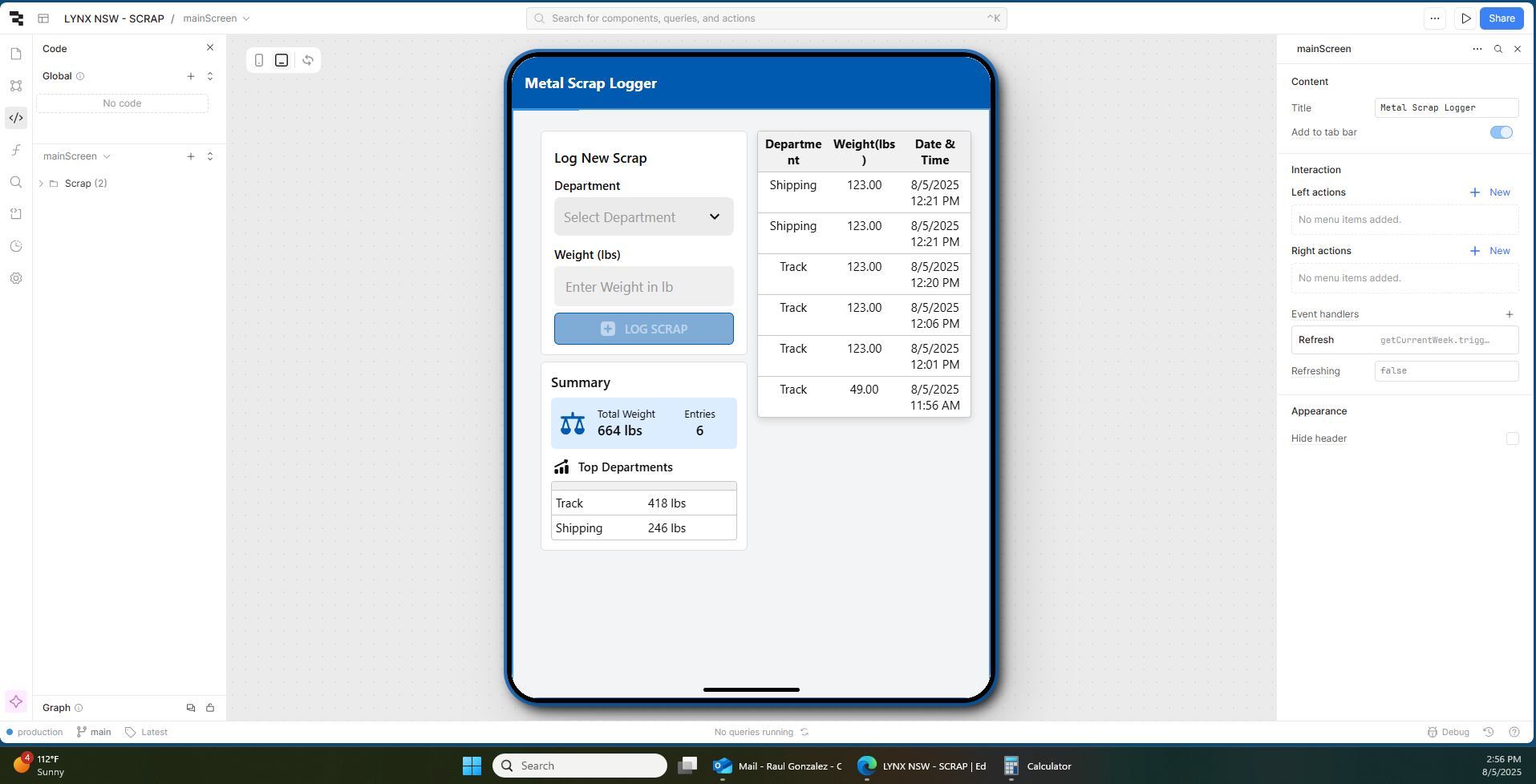 To make the tablet app look exactly like it appears in the Retool editor β same layout, spacing, and alignment. This is a simple app for logging metal scrap by department and weight, meant for warehouse use on tablets.