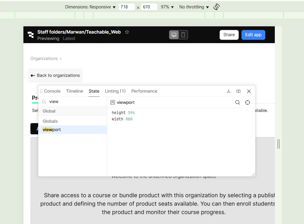 Screenshot using the responsive screen width option showing the actual width to be 718px but the viewport width is stuck at 800px.