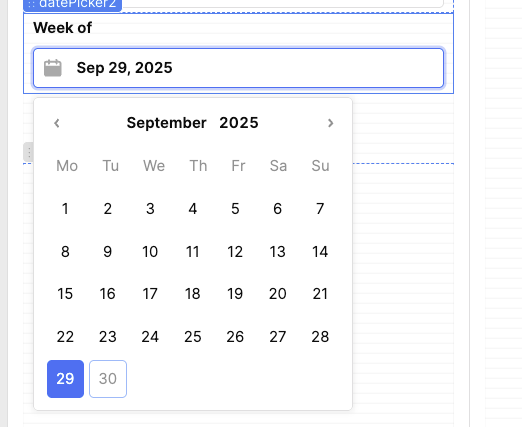 const date = new Date({{year1.value}}, {{month1.value}} - 1, 1);// Find the first Monday