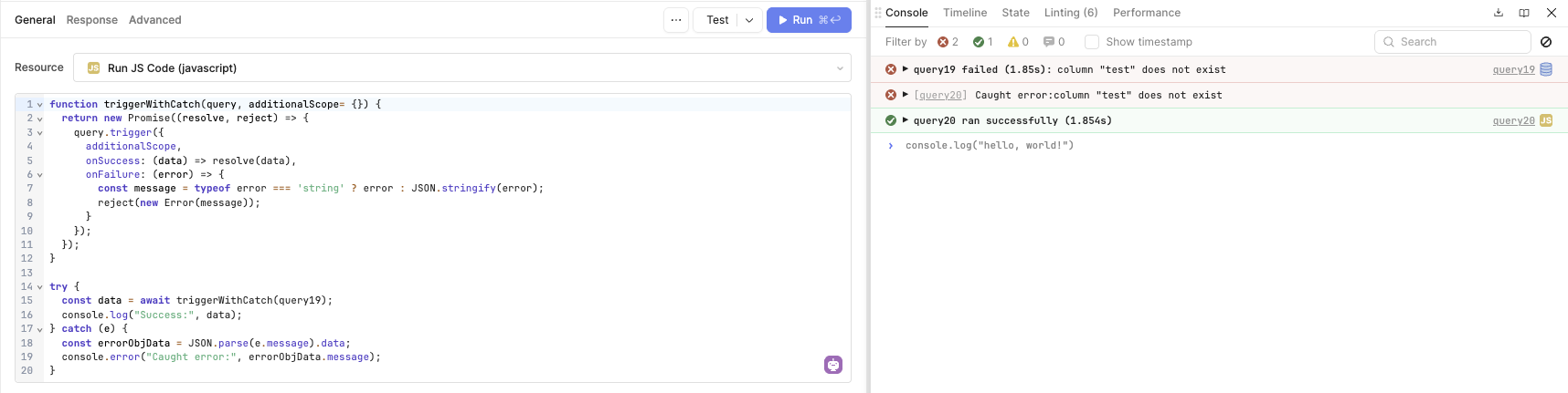 Currently, if a query is triggered using the trigger() method, it will resolve even if the triggered query fails, preventing the catch block from being run.