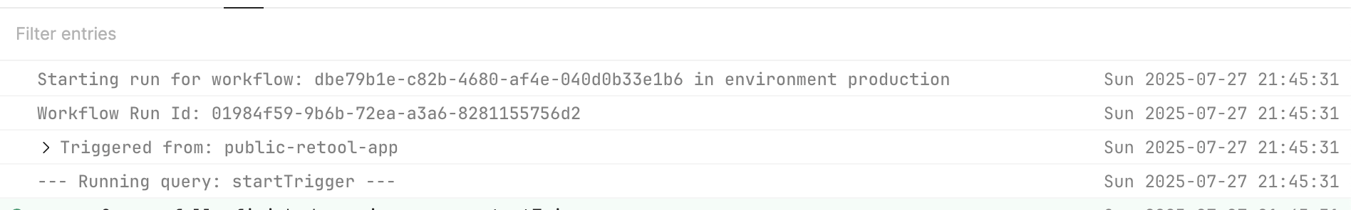 Lastly, screenshots of the duplicated workflow logs would be helpful as well. It should look something like this: