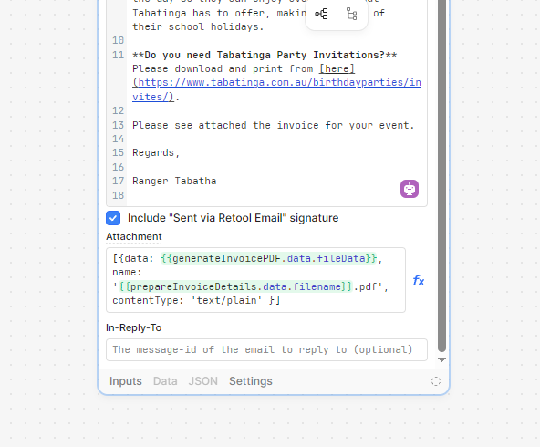 Both the âgenerateInvoicePDFâ and âprepareInvoiceDetailsâ are two prior steps in the workflow that seem to complete successfully.