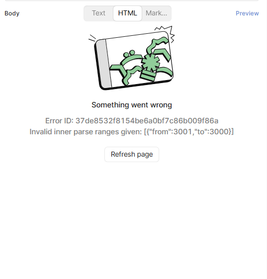 Invalid inner parse ranges given: [{"from":3001,"to":3000}]Because of this, I cannot edit or update the email content at all.