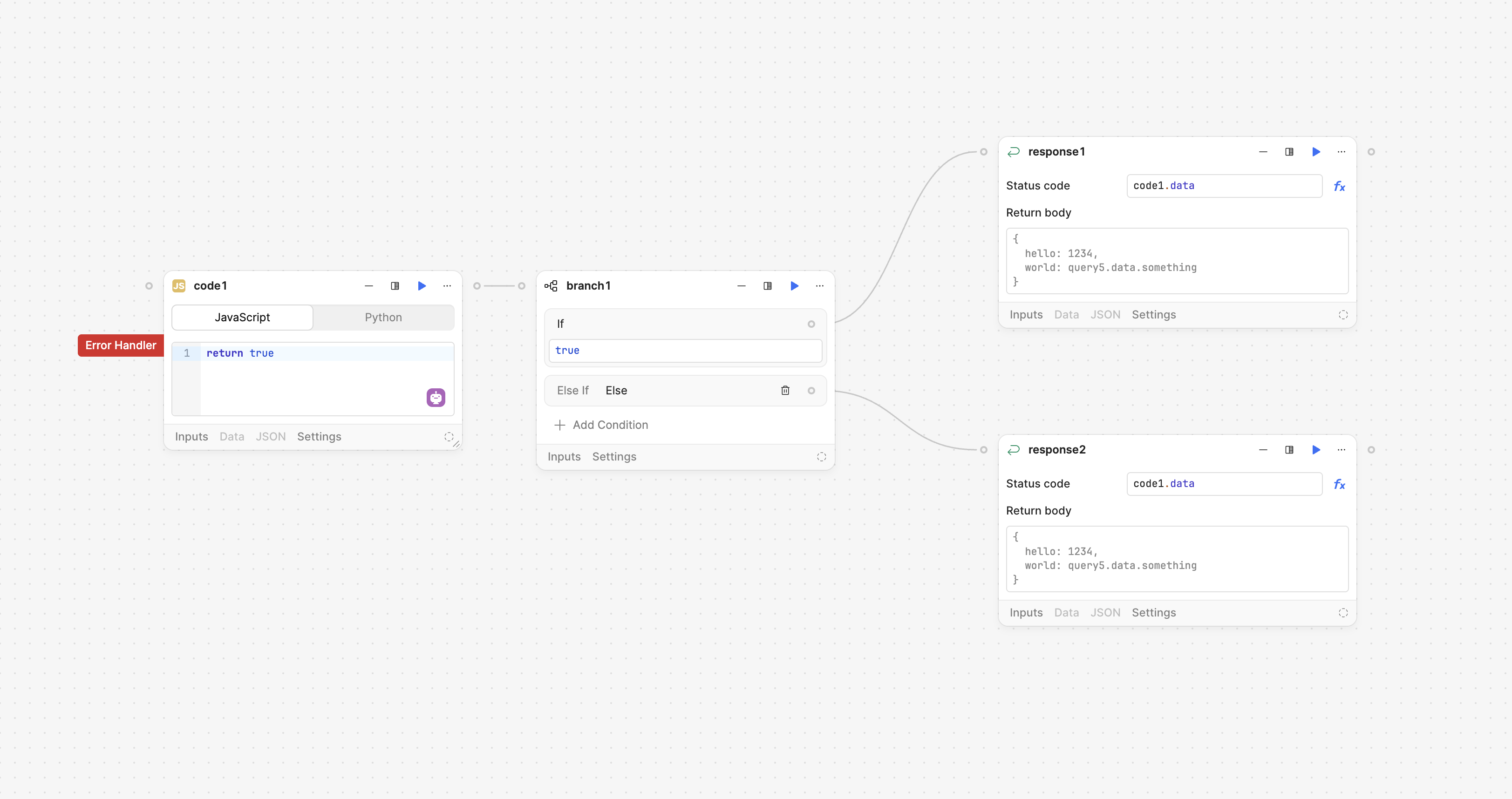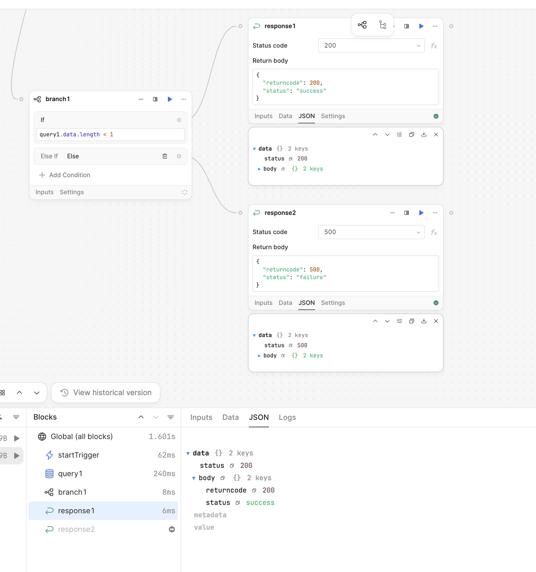 I have a workflow with two Response blocks, one for success and one global error handler.