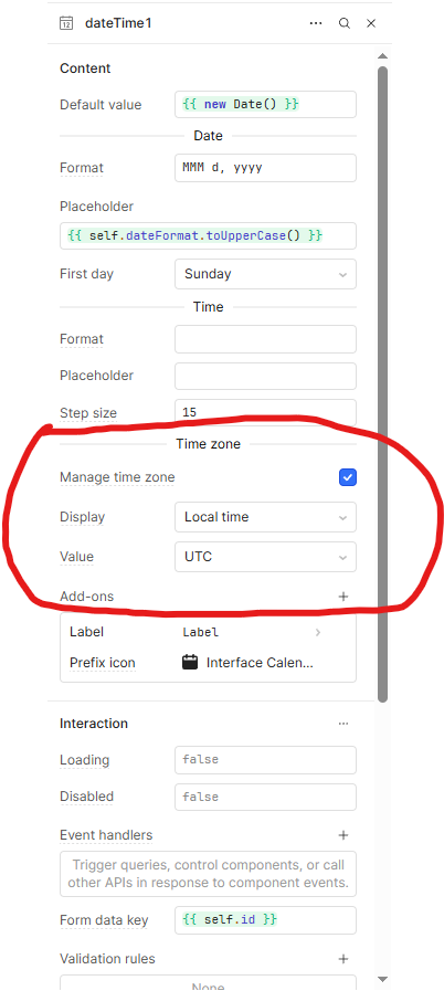 displayValue) to the user based on the selected offset without alteringvalueitself. Similarly, when a user selects a different date time value, this changes thedisplayValue. Retool uses the same offset to calculate the actualvalueto use.To manage time zones on these components, toggle Manage time zone in the Inspect tab of the right panel. The demo app below shows the difference in how date and time values appear when using managed and unmanaged time zones. Each component has the same underlying value.