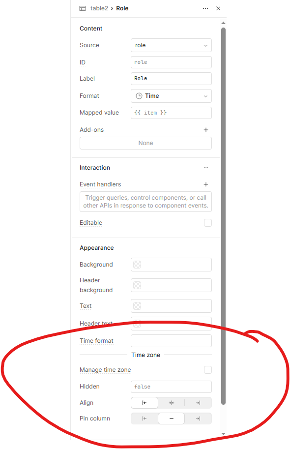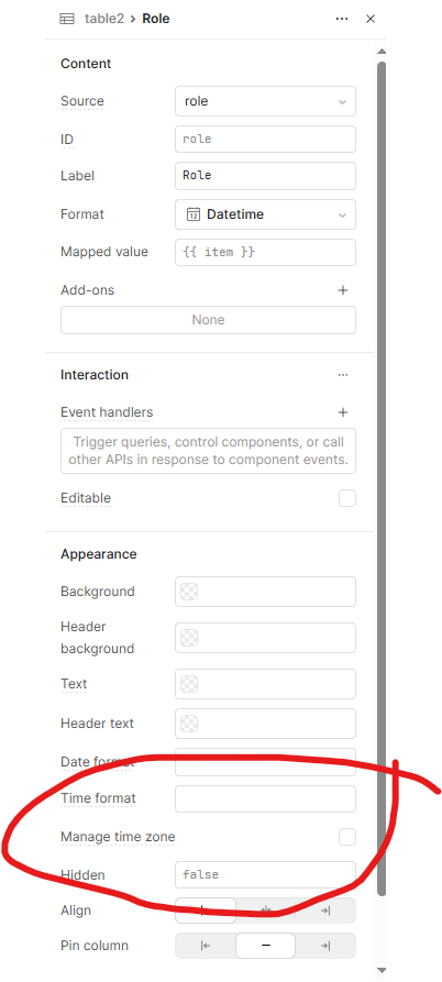 Steps I've taken to troubleshoot: searching retool forums, searching google, searching youtube, looking for any screenshot to show where āmanage time zoneā might be. The table-component doesnāt seem to have any time-zone features in āinspectā and the timestamp column itself, doesnāt either.
